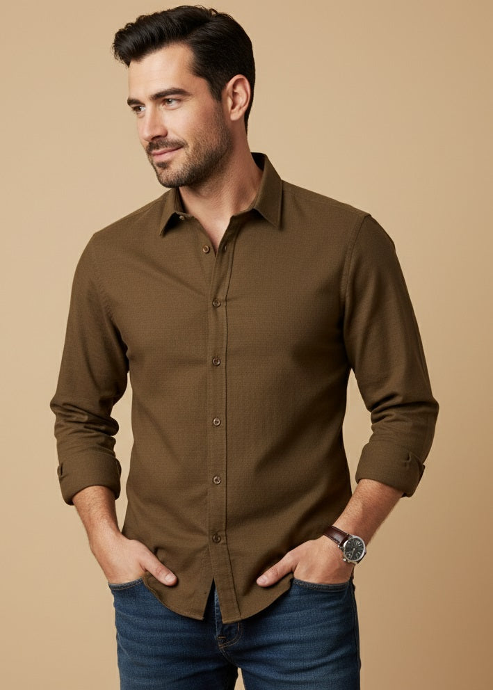 Men Brown Band Collar Long Sleeve Solid Regular Fit Cotton Shirt