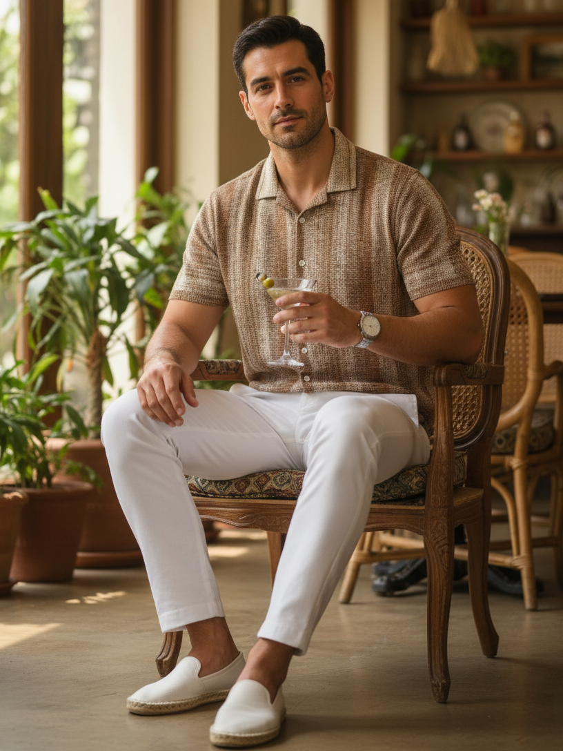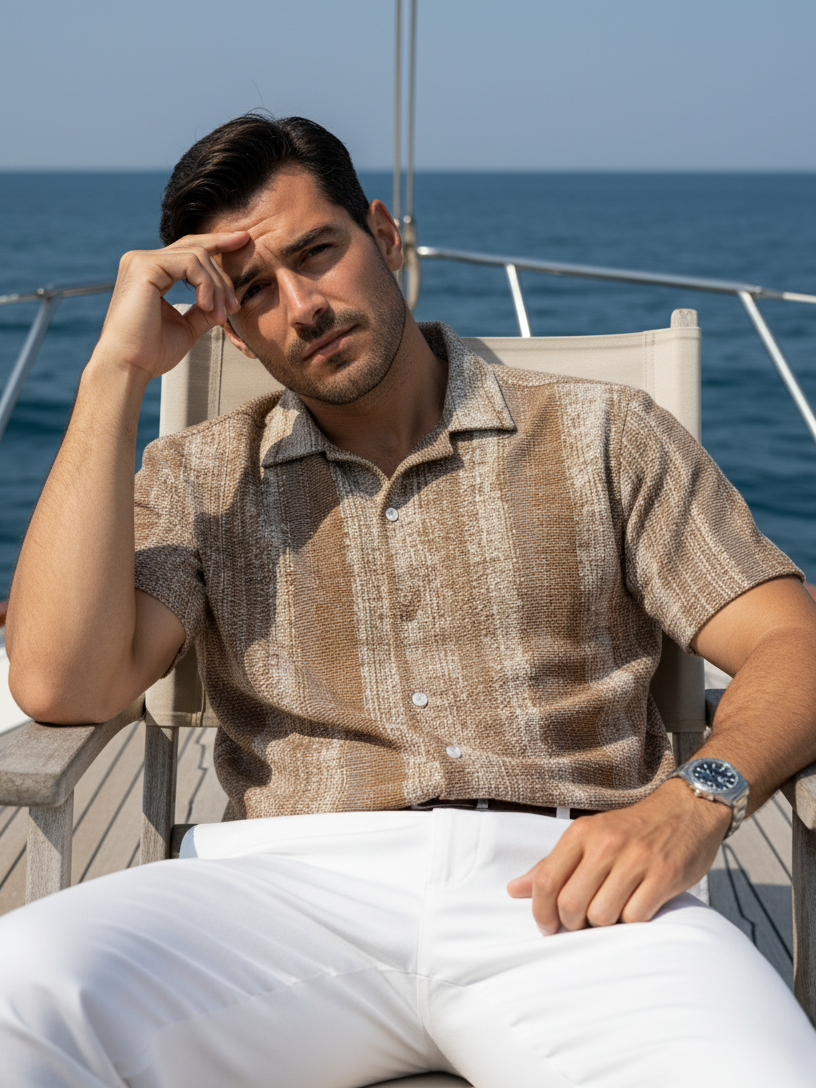 Experience timeless style with this brown striped cotton shirt, designed for the modern man who values both comfort and refinement. The vertical stripe pattern adds visual interest while maintaining an air of understated elegance, complemented by a distinctive band collar. Constructed from breathable cotton with wrinkle-resistant properties, it keeps you looking sharp without constant maintenance. The regular fit provides an ideal balance of structure and ease, while short sleeves offer practical versatility. Style it with classic denim and minimalist sneakers for an effortlessly sophisticated casual ensemble.