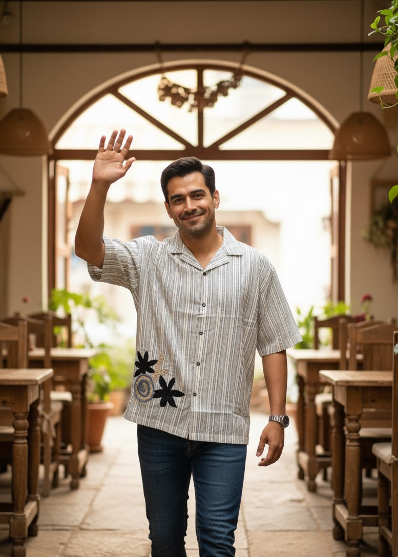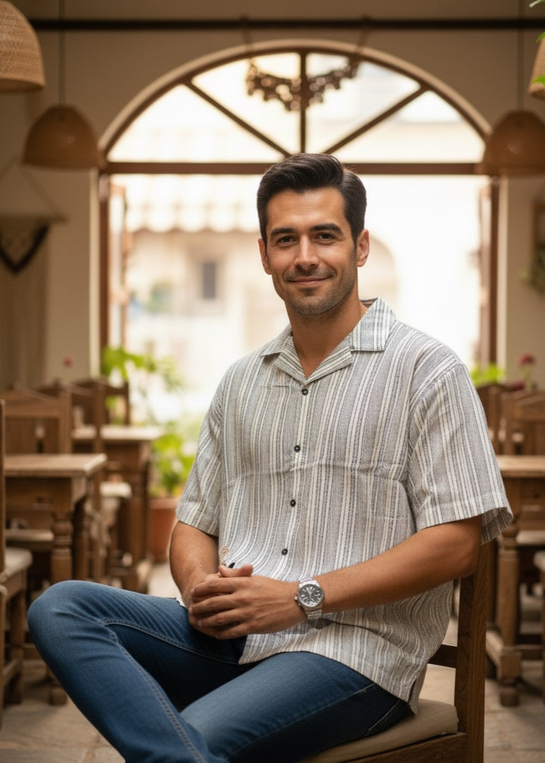 Men Off White Cuban Collar Short Sleeve Striped Relaxed Fit Cotton Shirt