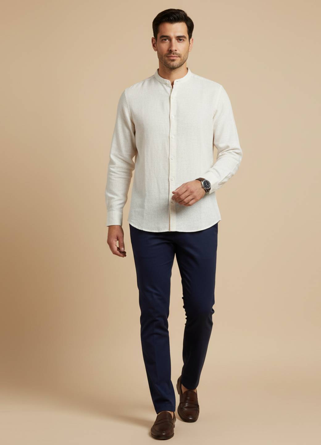 Men Off White Mandarin Collar Regular Fit Solid Cotton Shirt