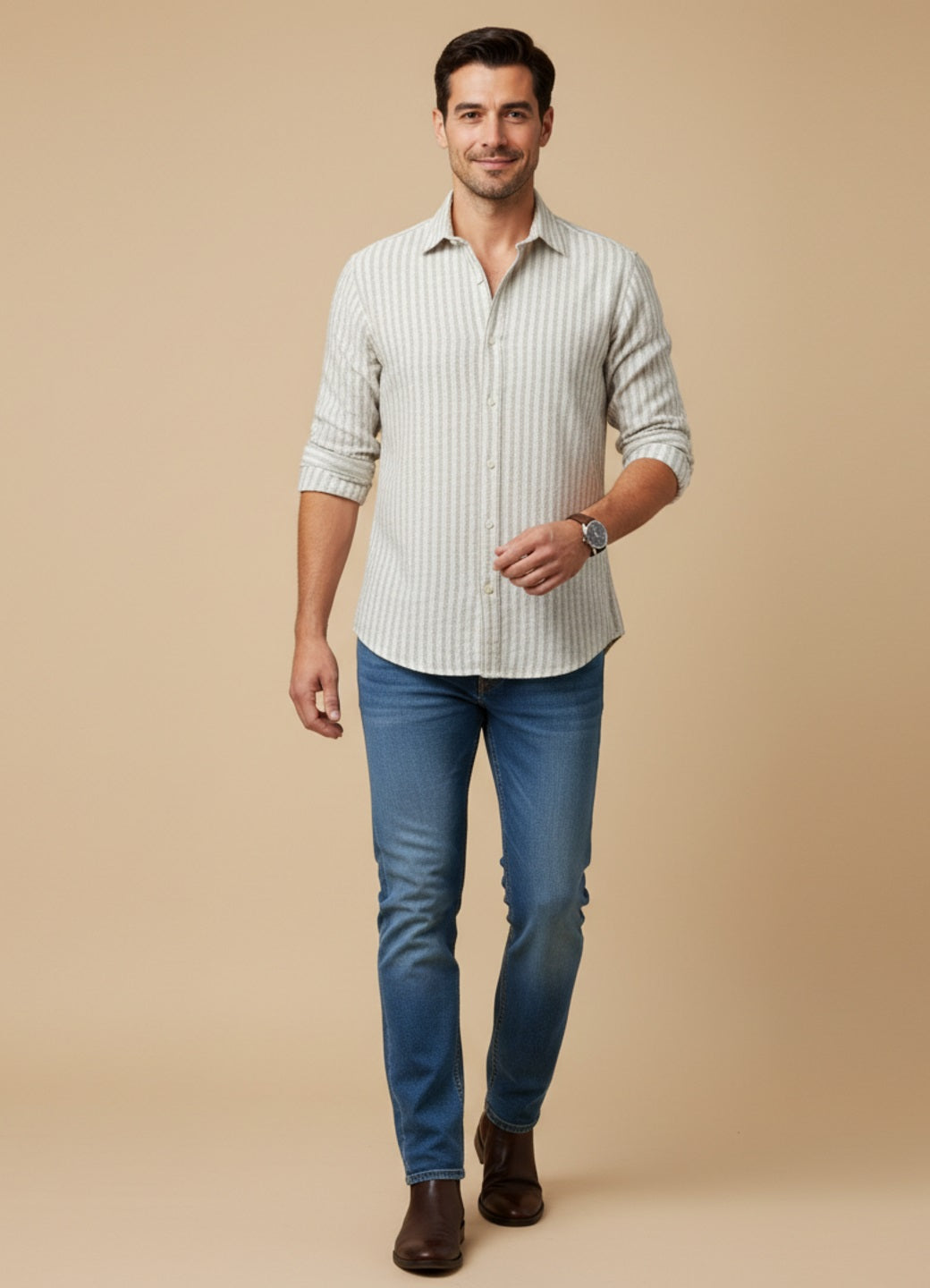Elevate your everyday wardrobe with this refined cotton shirt, crafted in a sophisticated off-white hue accented by subtle vertical stripes. The band collar and long sleeves deliver a polished silhouette, while the regular fit ensures comfortable, versatile styling. Engineered with wrinkle-free technology, this piece maintains its pristine appearance throughout the day—ideal for both professional settings and relaxed occasions. Pair effortlessly with denim and sneakers for an understated casual aesthetic that exudes timeless elegance.