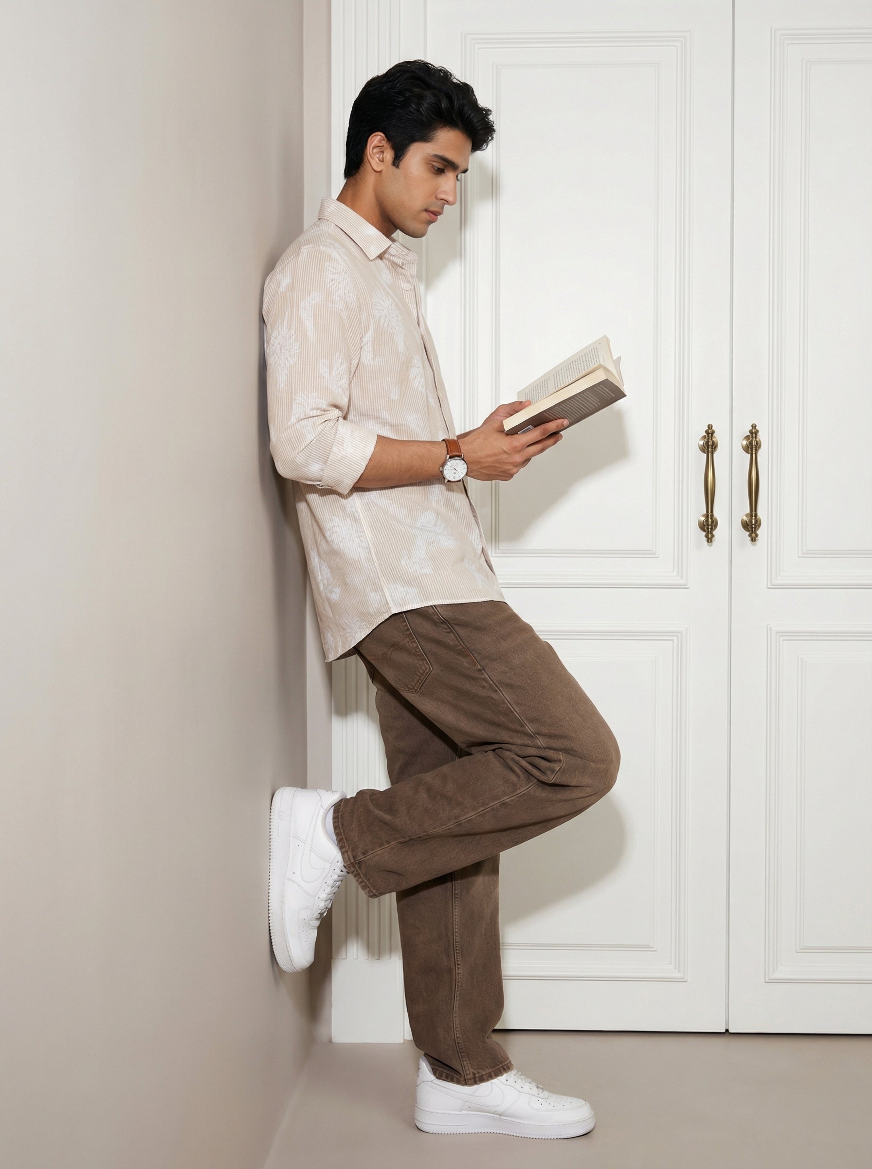 Men's Brown Spread Collar Floral Print Pure Cotton Shirt