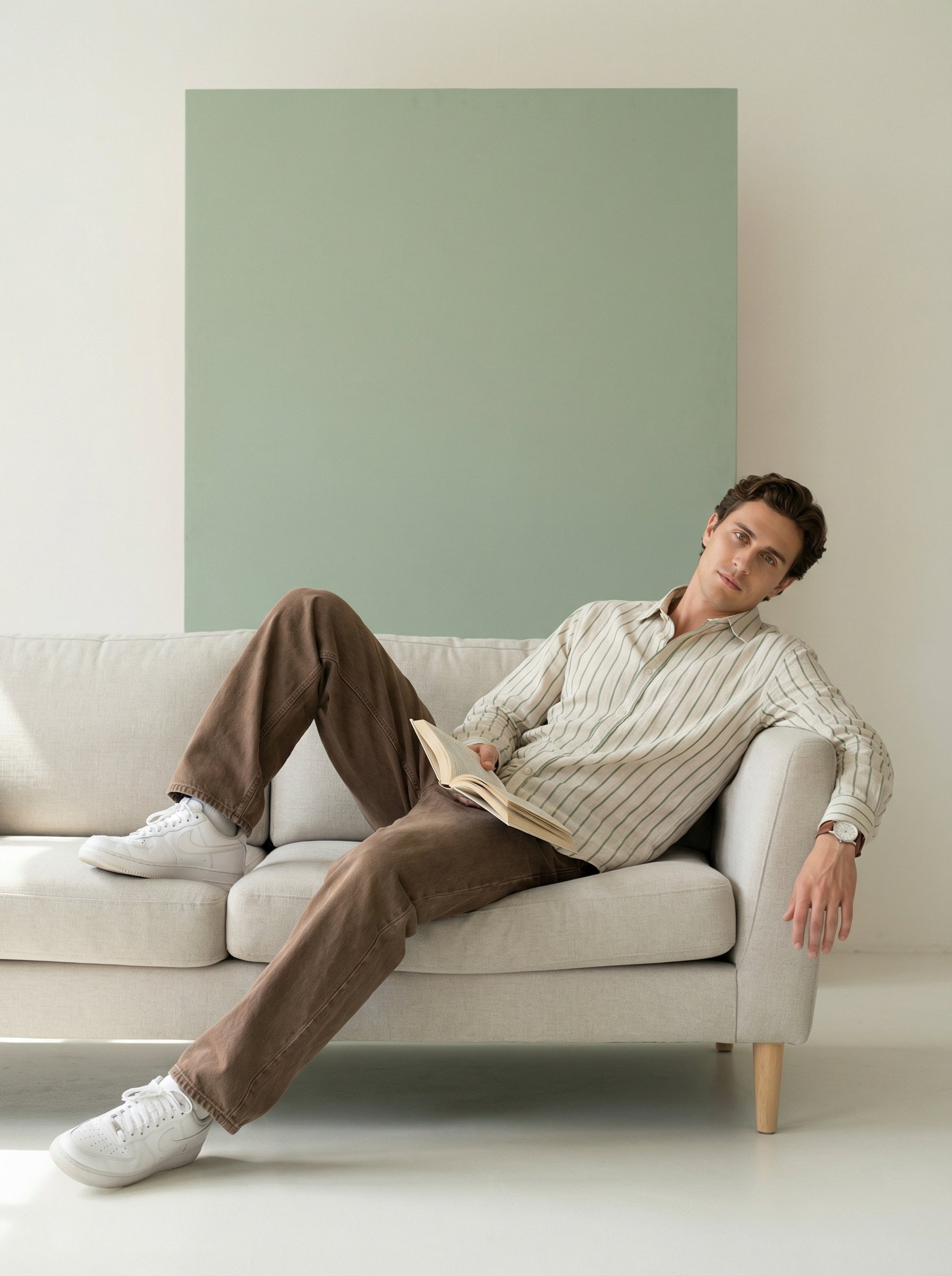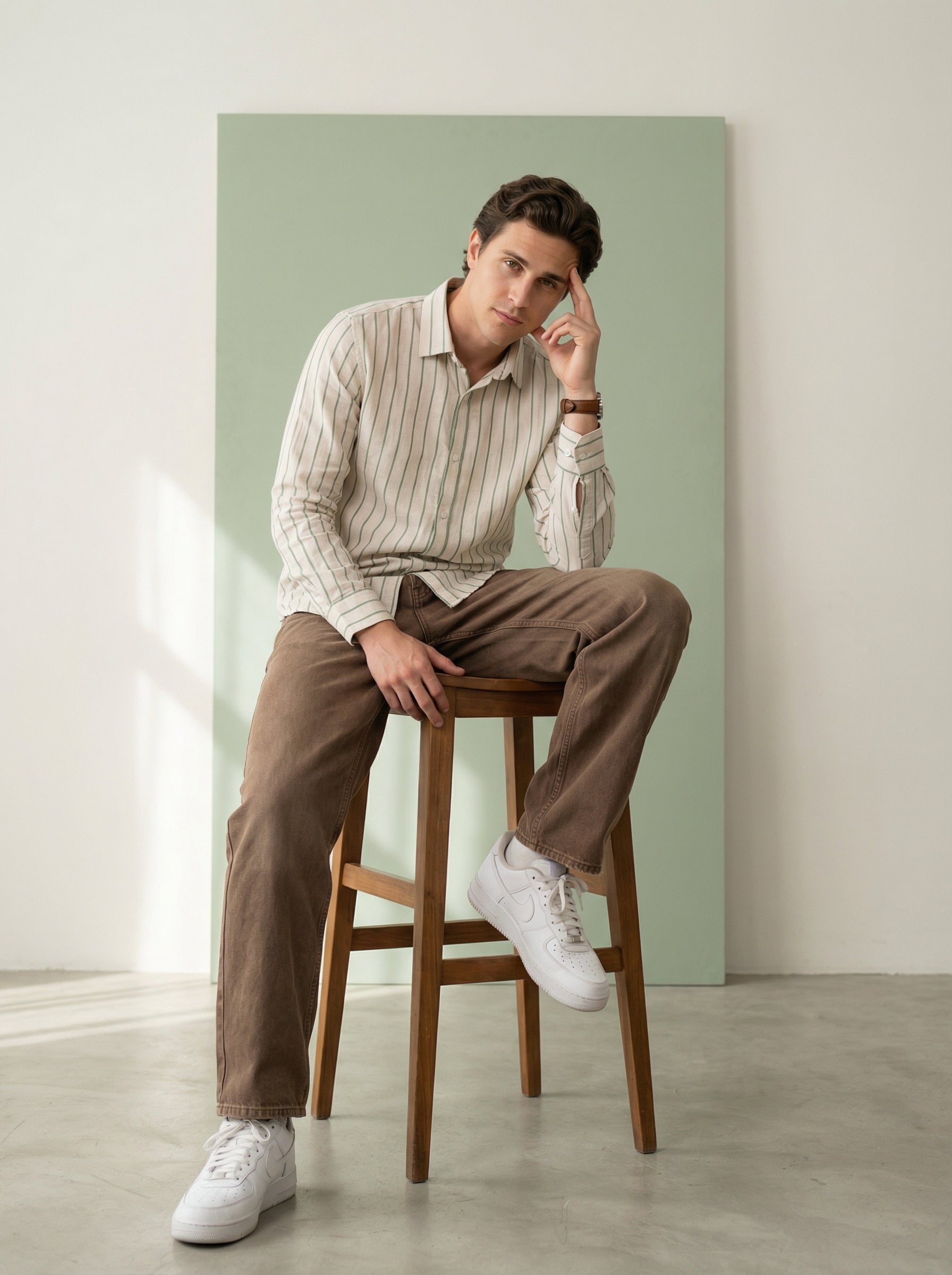 Men's Green Band Collar With Full Sleeves Vertical Stripes Pure Cotton Shirt