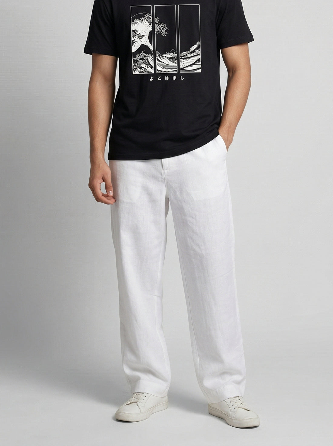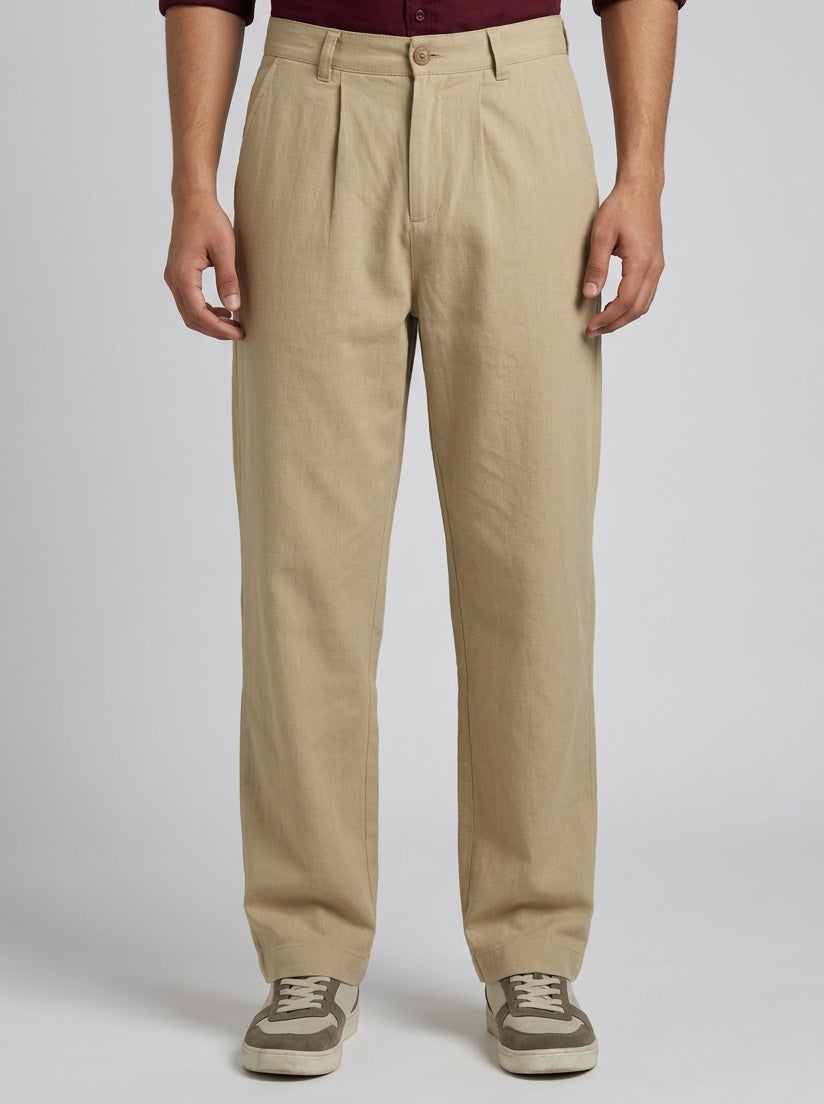 Cream Lightweight Linen-Look Relaxed Fit Trousers For Men