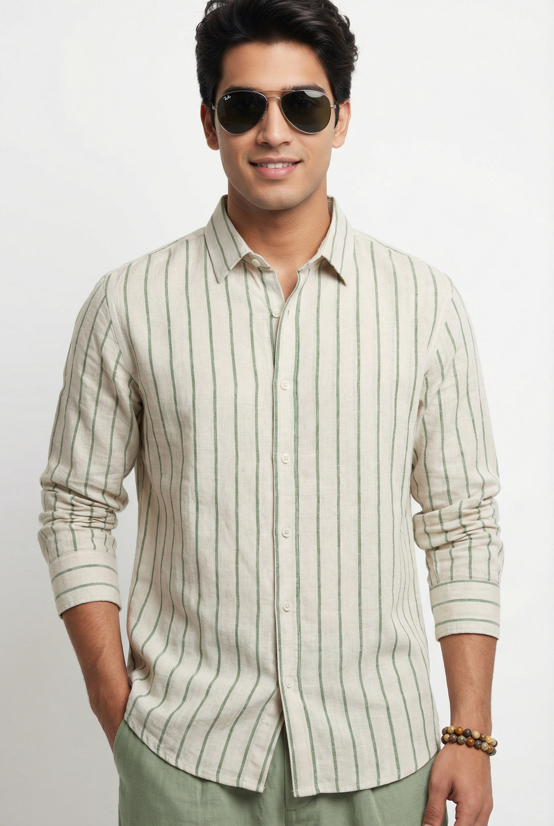 Green Striped Band Collar Men's Shirt (Handloom Fabric)