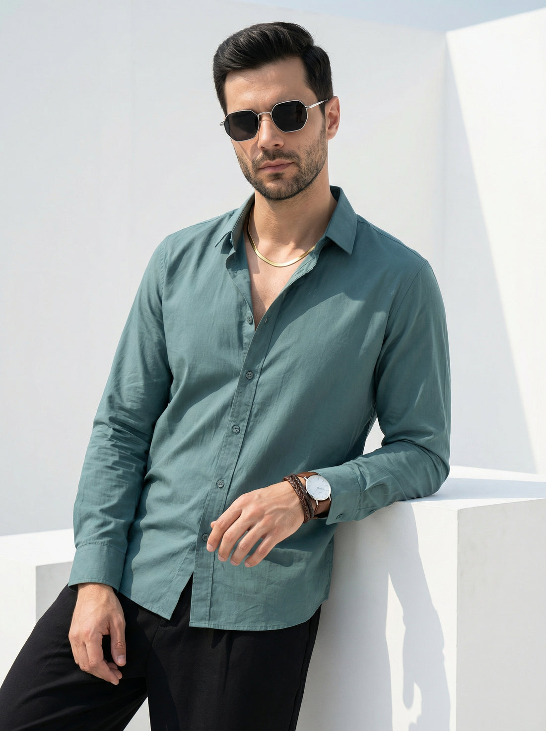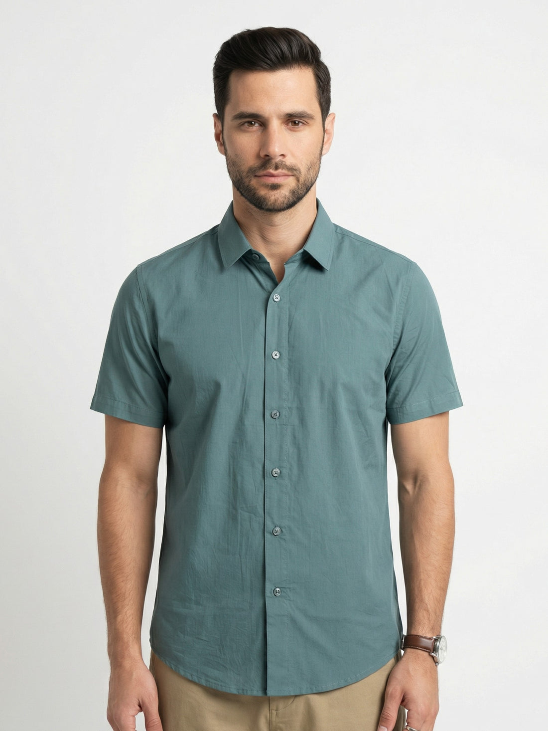 Elevate your casual wardrobe with this versatile sea green cotton shirt, featuring a distinctive Cuban...