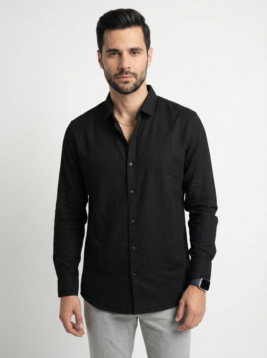 Elevate your everyday wardrobe with this bold black cotton shirt that refuses to blend in....