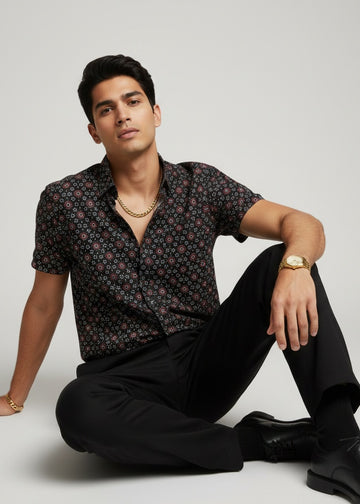 Elevate your casual wardrobe with this sophisticated men's black printed cotton shirt, featuring a distinctive...