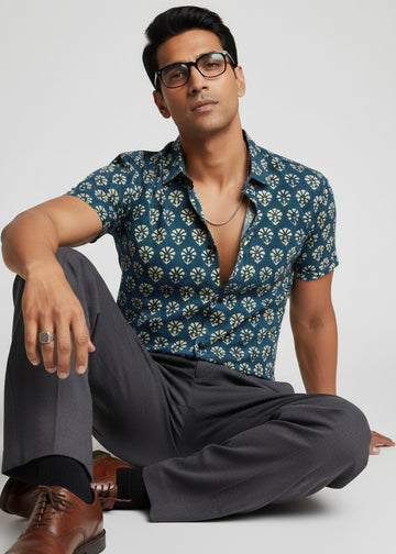Green Floral Spread Collar Regular Fit Pure Cotton Men's Shirt