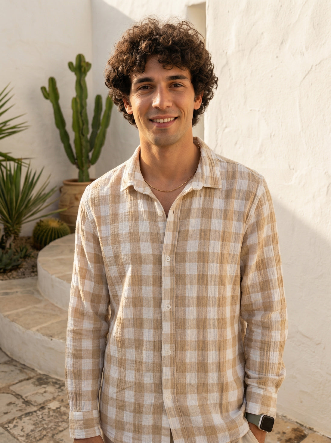 Elevate your casual wardrobe with this versatile Beige cotton shirt. Featuring a distinctive band collar...