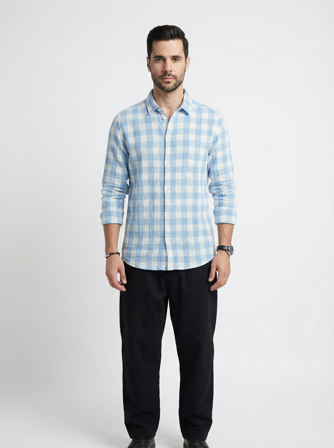 Upgrade your everyday wardrobe with this classic Blue Spread Collar Gingham Checks Cotton Men's Shirt,...