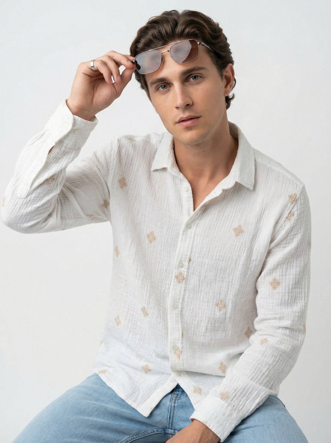 Enhance your wardrobe with this stylish White Spread Collar Geometric Print Cotton Men's Shirt, designed...