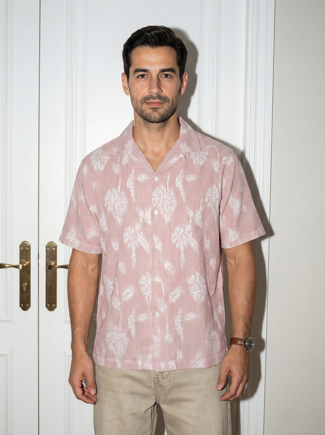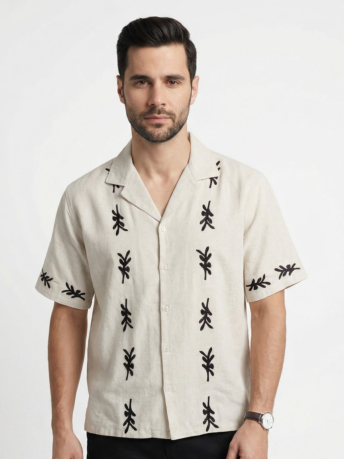 Brown Floral Cotton Cuban Men's Shirt (Handloom Fabric)